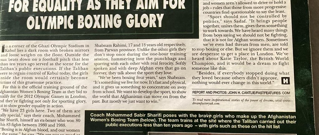 The article profiles a young Afghan boxer forced to flee Kabul due to Taliban threats. It showcases her journey as a refugee, training abroad to continue advocating for Afghan women’s rights.